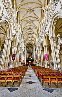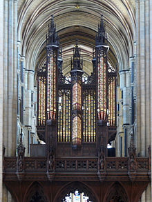 Rayonnant (French word meaning "radiating") specifically describes the radiating spokes of the rose windows in French and other Gothic architecture between c. 1240 and 1350, characterized by a shift in focus away from the High Gothic mode of utilizing great scale and spatial rationalism towards a greater concern for two dimensional surfaces and the